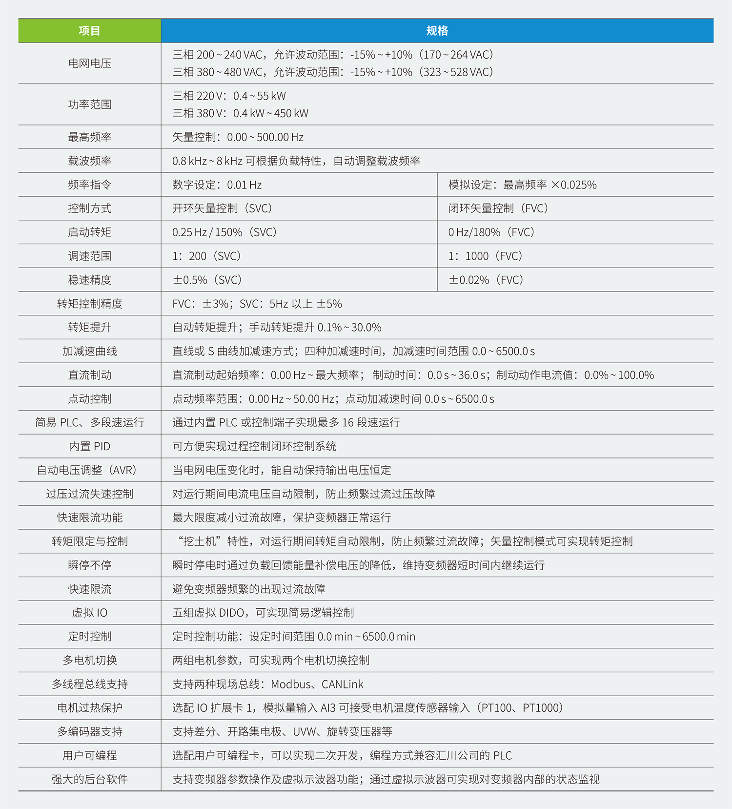 MD500E 系列變頻器是一款通用高性能電流矢量變頻器,主要用于控制和調(diào)節(jié)三相交流同步電機的速度和轉(zhuǎn)矩,是MD380E 系列的技術(shù)升級產(chǎn)品。MD500E 采用高性能的矢量控制技術(shù),低速高轉(zhuǎn)矩輸出,具有良好的動態(tài)特性、超強的過載能力、增加了用戶可編程功能及后臺監(jiān)控軟件,通訊總線功能,支持多種PG 卡等,組合功能豐富強大,性能穩(wěn)定。